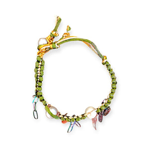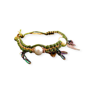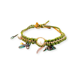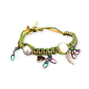 This vibrant anklet features a combination of green, sand, and brown silk materials, adorned with AAA freshwater pearls. The rose gold plated heart, angel wing, and accents add a touch of elegance, while the adjustable slip knot ensures a perfect fit. The rainbow stainless steel paperclip chain adds a unique touch to this charming piece.