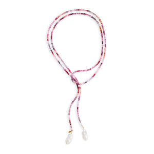The Rose Lariat is a unique and stylish piece of jewelry. It features AAA Ombre Spinel Pink Gemstones Heart Head Pins and AAA Baroque Freshwater Pearls. This beautiful piece was created in collaboration with fashion blogger and stylist Dara Goldstein @carryonaboutstyle.